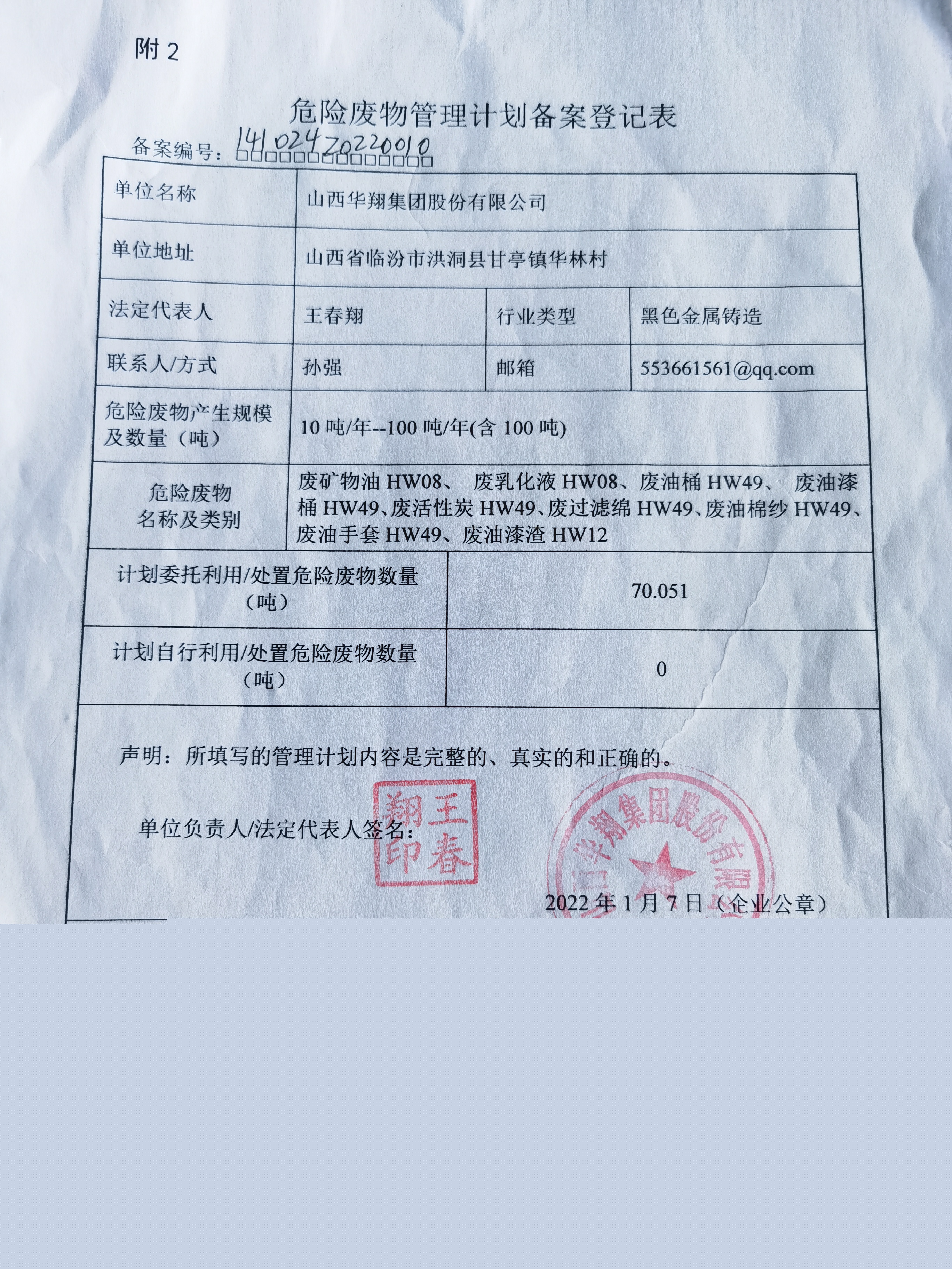 山西華翔集團股份有限公司危險廢物污染防治責任信息公示